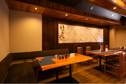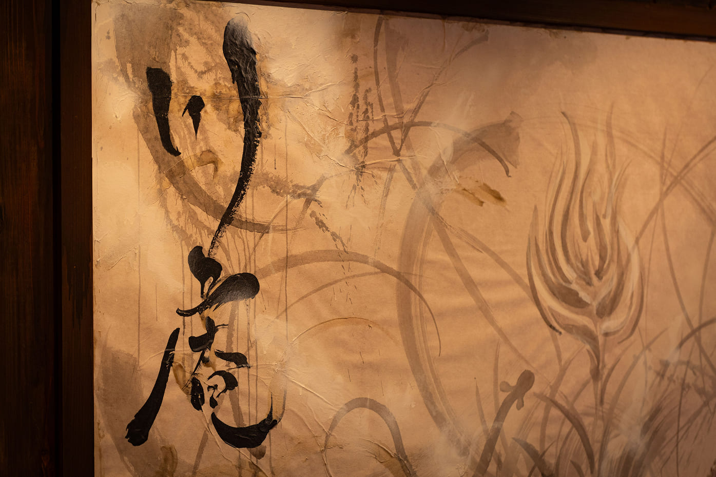 店内の壁を彩るのは、アーティスト中塚ムネフミ氏による作品。当店のために和紙を貼り、一晩で描き上げられた力強い筆致は、料理と同じく「その瞬間にしか生まれないもの」。うなぎの一皿と共に、ここでしか味わえない空間をお楽しみください。