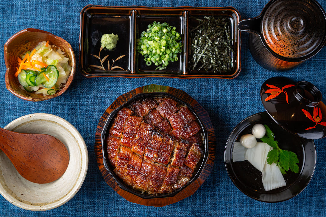 皮は香ばしくパリッと、中はふっくら柔らかく仕上げています。定番のうな重は、辛口仕立てのたれと国産米が織りなす王道の味わい。ひつまぶしは、薬味や出汁を加えることで三度の変化を楽しめる逸品です。